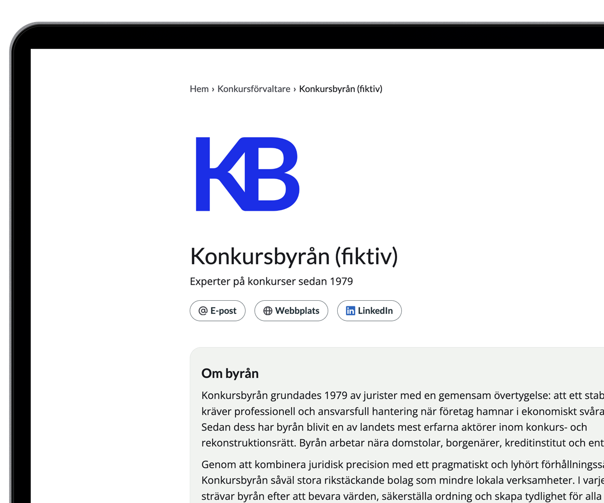 Som konkursförvaltare, kan du se på oss som en blandning mellan Hemnet och Legal 500.
